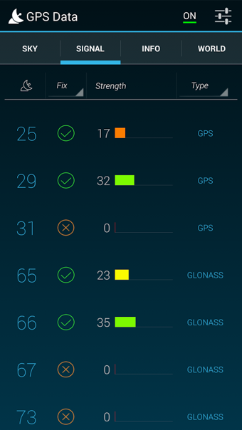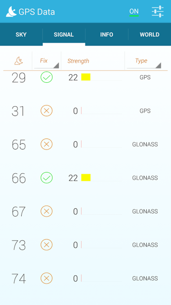 四個(gè)不同的選項(xiàng)卡為您服務(wù)測(cè)試,看看你的GPS數(shù)據(jù):1)信號(hào)“選項(xiàng)卡-信號(hào)強(qiáng)度視圖顯示了力量與設(shè)備連接的衛(wèi)星圖。每個(gè)條形代表一個(gè)衛(wèi)星,酒吧的高度是接收到的信號(hào)強(qiáng)度成比例。