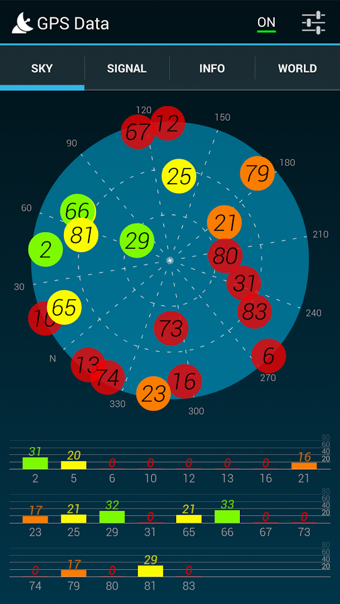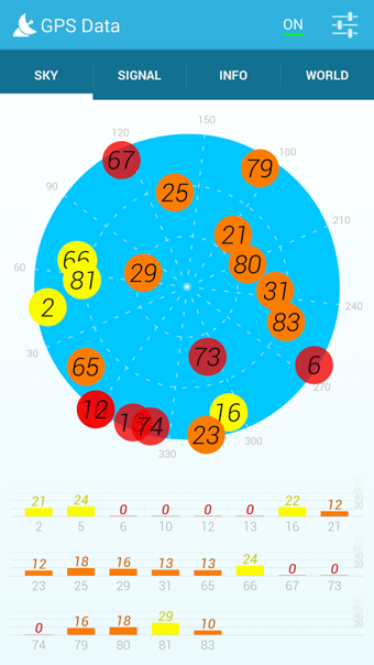 2)天空“選項(xiàng)卡-天空地圖視圖顯示與設(shè)備的衛(wèi)星在天空中的定位。每個(gè)小圓圈代表一個(gè)衛(wèi)星信號(hào)強(qiáng)度和它的地位足以與顏色。天空地圖旋轉(zhuǎn)圈是根據(jù)設(shè)備指南針。