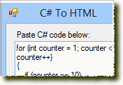 C# to HTML v1.0 綠色版 C# to HTML 是一款簡(jiǎn)單方便的工具,可以將 C# 代碼集成在 HTML 頁(yè)面上。C# 為 HTML 分析代碼,自動(dòng)生成的樣式表,使您可以將它保存到您的計(jì)算機(jī)。此外,您可以將代碼復(fù)制到剪貼板中。輸出的是顏色編碼,它更易于閱讀,并且符合 HTML 標(biāo)準(zhǔn)。