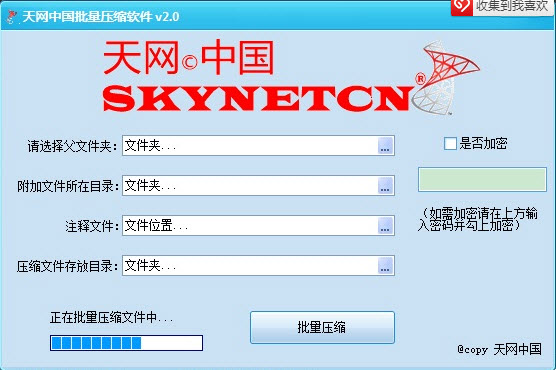天網(wǎng)中國(guó)批量批量壓縮是一種批量rar文件壓縮工具,是使用方便的rar批量工具,體積小,可以對(duì)要壓縮文件夾進(jìn)行添加文件,添加注釋?zhuān)砑訅嚎s密碼,執(zhí)行批量壓縮。