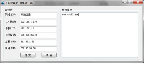 天網(wǎng)聯(lián)盟ip一鍵設(shè)置方便快捷的設(shè)置本地ip地址,軟件小巧使用容易。