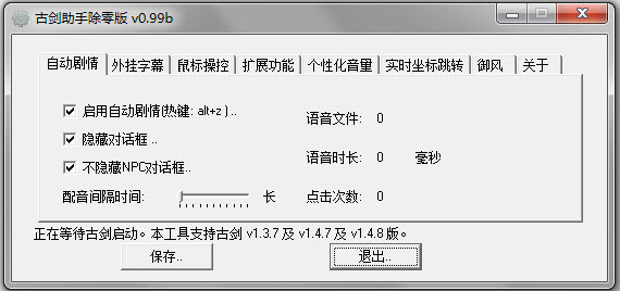 v0.72 添加隱藏對(duì)話(huà)框功能,暫時(shí)需要先運(yùn)行古劍,并進(jìn)入游戲之后,再運(yùn)行本工具才有效