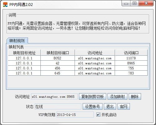 簡單易用在客戶端添加映射的規(guī)則實時生效,馬上就能映射出外網(wǎng),無需繁瑣的設(shè)置過程。穿透性強面對電信運營商的嚴格限制,PP內(nèi)網(wǎng)通通過先進的技術(shù)手段,保證只要能打開網(wǎng)頁,就能映射成功。