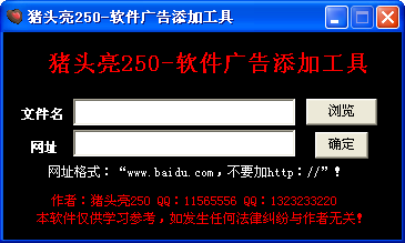 豬頭亮250軟件廣告添加工具是推廣的必備工具,使用本軟件,可以對(duì)任意exe文件加入網(wǎng)址,加入網(wǎng)址成功后,運(yùn)行exe文件時(shí)會(huì)自動(dòng)打開加入的網(wǎng)址,歡迎下載體驗(yàn)。