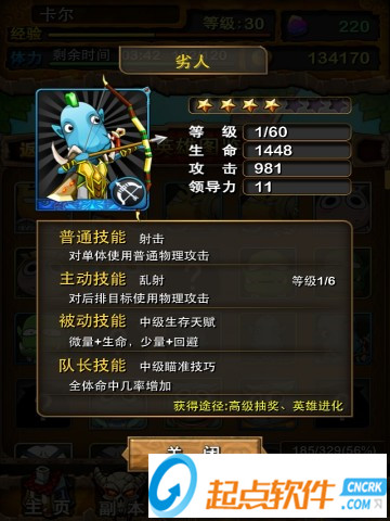 1. 第一種類型的獵人為生存能力較強(qiáng)的,被動(dòng)技能為回避和生命加成。配合主動(dòng)技能亂射(對(duì)后排目標(biāo)進(jìn)行物理攻擊),對(duì)切后排小怪效果比較明顯。如圖所示: