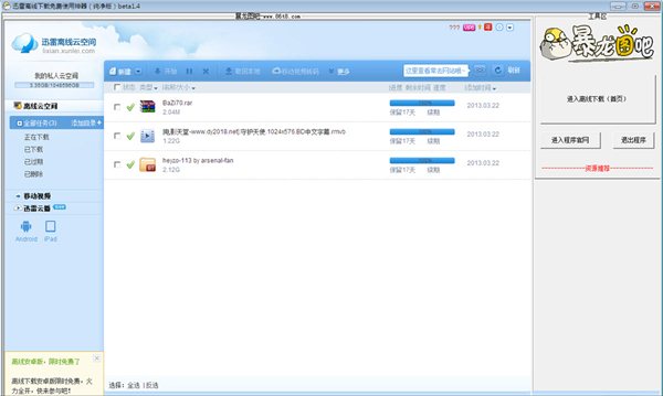 迅雷離線下載免費(fèi)使用神器由暴龍圖吧制作,是一款可以免費(fèi)無(wú)限制使用迅雷離線下載的實(shí)用工具。設(shè)有100萬(wàn)GB的離線空間,讓你免費(fèi)無(wú)限制使用。你只需要把需要下載的資源添加到離線下載任務(wù)中,就可以關(guān)機(jī)去做其他事了,過一段時(shí)間之后你再開機(jī)從迅雷的專用服務(wù)器上高速copy這個(gè)資源就可以了。相比常規(guī)的下載方式,離線下載省時(shí)省電。