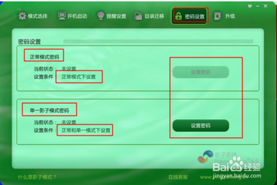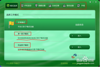 模式選擇:正常模式、單一模式、完全模式。三種模式保護范圍不同,正常是不保護,單一是保護系統(tǒng)盤,完全是保護全部分區(qū)。