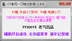 cf老弓一刀給力秒殺支持最新的穿越火線1.9.9客戶(hù)端,本輔助自動(dòng)開(kāi)啟,無(wú)功能菜單,請(qǐng)?jiān)谟螒騼?nèi)通過(guò)按鍵使用。