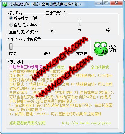 QQ對對碰助手為qq游戲?qū)ε龅妮o助工具。對對碰助手有3種使用模式:提示模式、自動模式與全自動模式。提示模式可以提示一次應(yīng)該交換的動物位置;自動模式可以自動交換一次動物位置;全自動模式則可以自動游戲完成一局游戲,并且能自動準(zhǔn)備,自動開始!