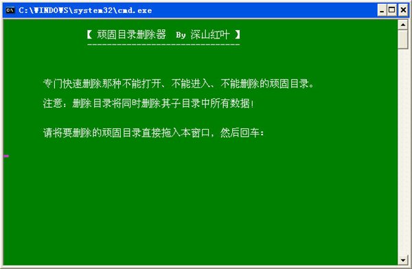 注意刪除目錄將同時(shí)刪除其子目錄中所有數(shù)據(jù)。使用方法很簡(jiǎn)單,只要將要?jiǎng)h除的頑固目錄直接拖入到該軟件的窗口內(nèi),然后回車即可。