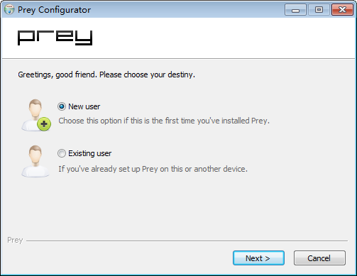 5.點選”New User”來注冊一個帳號吧!如果你已經(jīng)有Prey帳號的話,點選”Existing User”來進行登入。