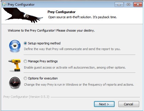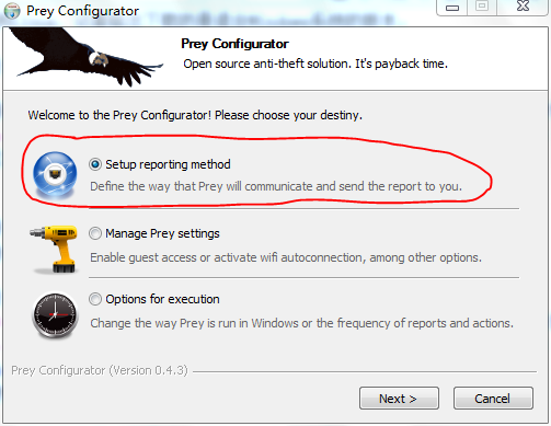 3.第一次使用時必須先進行設(shè)定,以及注冊帳號才能讓Prey取得追蹤。點選”Setup Reporting Method”后到下一步。