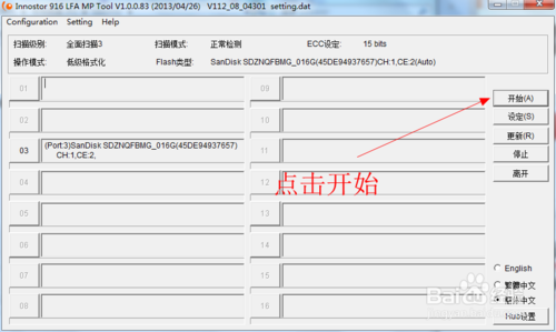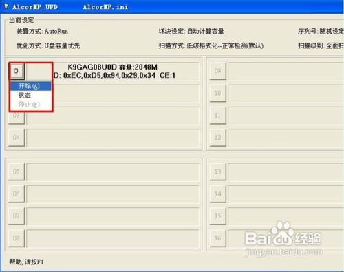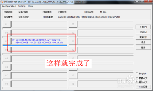 8.設(shè)定窗口關(guān)閉后,回到量產(chǎn)工具主界面,這時(shí)點(diǎn)“開始”來開始量產(chǎn),出現(xiàn)進(jìn)度條,直到提示成功