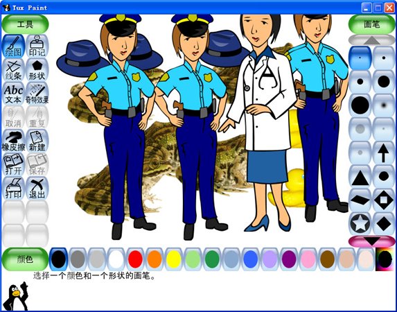 各種tuxpaint 可用的圖章(Stamps)在其它繪圖程序中一般叫作剪貼畫,它們的數(shù)量相當(dāng)多!可以改變它們的顏色也同樣能夠改變它們的大小以及翻轉(zhuǎn)它們。我真的被許多來(lái)自Tuxpaint中的圖章(Stamps)給深深的吸引了!