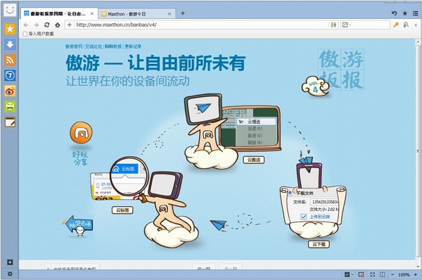 基于成熟瀏覽核心,傲游云瀏覽器Mac版延續(xù)了其Windows瀏覽器多年的優(yōu)良操作體驗。針對用戶在Mac OS中的操作習(xí)慣,進行了優(yōu)化和升級,使用戶不再受單一操作系統(tǒng)的限制。用戶只需申請傲游賬號,既可實現(xiàn)個人賬戶在不同設(shè)備、不同操作系統(tǒng)間云端全面數(shù)據(jù)同步。云推送 - 支持跨平臺設(shè)備(Windows, Android, iOS)傳送文字、圖片和鏈接云下載 - 隨時隨地上傳云端,與Windows,Android,iOS平臺進行數(shù)據(jù)共享,并支持各種文件格式下載云標簽 - 隨時打開其他設(shè)備上的標簽內(nèi)容,目前支持與Windows, Android, iOS多平臺設(shè)備間任意同步云同步 - 收藏、選項設(shè)置、智能填表等賬戶數(shù)據(jù)瞬間同步,實現(xiàn)與Windows, Android, iOS平臺設(shè)備上的無縫連接