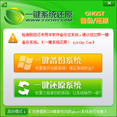 3、備份完畢后重新啟動(dòng)電腦,打開一鍵還原程序即可看到程序自動(dòng)檢測(cè)到剛剛備份了系統(tǒng)。以后當(dāng)系統(tǒng)中毒或是出現(xiàn)其它問(wèn)題時(shí)點(diǎn)擊一鍵還原系統(tǒng)( 請(qǐng)?jiān)谶€原之前提前備份好系統(tǒng)盤的個(gè)人資料,還原時(shí)將對(duì)C盤原有數(shù)據(jù)進(jìn)行覆蓋。 )即可將系統(tǒng)恢復(fù)到之前備份的狀態(tài)。