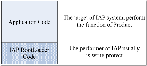 首先簡單介紹一下STM32的IAP。IAP(In-application-programming),即在應(yīng)用中編程。有了它,產(chǎn)品發(fā)布之后,仍然可 以方便的升級(jí)固件,而不需要拆機(jī)并用JTAG等方式更新程序。IAP系統(tǒng)的固件一般有兩部分組成,IAP BootLoader Code和Application Code,如下圖所示。