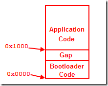 系統(tǒng)啟動(dòng)時(shí),首先運(yùn)行IAP BootLoader Code,并檢測相應(yīng)狀態(tài),判斷是執(zhí)行升級(jí)的流程還是直接運(yùn)行本地的Application Code。 一般來說,BootLoader和Application是分別編譯的,會(huì)生成兩個(gè)二進(jìn)制文件。在工廠生產(chǎn)時(shí),如果分別燒寫這兩個(gè)文件,顯然有些麻煩。這 時(shí),我們就可以將兩個(gè)BIN文件合并成一個(gè),直接燒寫。假設(shè)Application Code的偏移地址為0x1000,IAP固件在Flash中的分布如下圖所示。