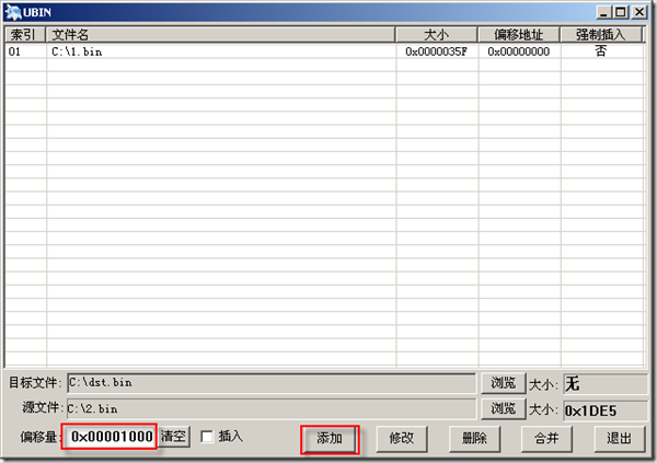 首先,添加第一個(gè)文件1.bin,其地址為0x0000,所以,偏移量設(shè)置為0x00000000,設(shè)置完偏移量后點(diǎn)擊“添加”按鈕。