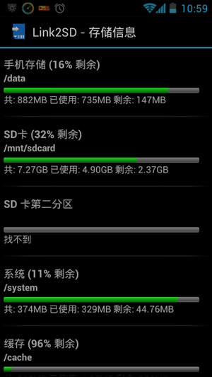 4、重啟手機(jī)后打開(kāi)link2sd,菜單鍵 ->存儲(chǔ)信息 ->查看是否掛載成功與各分區(qū)使用情況,如下圖: