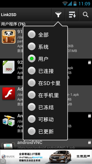 真正卸載Link2sd:首先 點(diǎn)擊 軟件頂部的 杯子 按鈕切換到 已連接,選擇所有APK ->操作 ->移除連接 ->將 apk dex lib都移回手機(jī)里,前提是手機(jī)空間足夠。