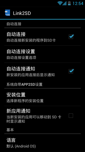 7、Link2Sd設(shè)置新安裝APK自動(dòng)移動(dòng)到ext分區(qū)并創(chuàng)建連接:手機(jī)菜單鍵 ->設(shè)置 ->自動(dòng)連接(打上勾),如下圖: