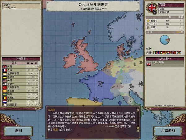 1.首先,第一步當(dāng)然是打開維多利亞2,選取英國,進入游戲