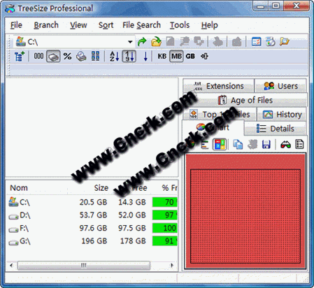 TreeSize Professional V5.4.2.695 英文綠色便攜版 這是一款windows9x/me/nt/2000/xp下強(qiáng)大靈活的硬盤空間管理工具。它能夠?yàn)槟氵x擇的幾個(gè)文件夾和驅(qū)動(dòng)器顯示其大小,已分配空間和被浪費(fèi)空間的大小,文件的數(shù)目,文件擁有者,3D條形和餅狀統(tǒng)計(jì)圖,最后訪問(wèn)的日期,NTFS壓縮率及更多其它信息