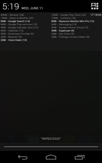這是一個迷你資源監(jiān)視器。它監(jiān)測可用內(nèi)存容量(MB)、CPU使用率(%)、CPU溫度、CPU頻率和迷你進程列表(通知面板)。它會經(jīng)常顯示在屏幕上。您可以指定顯示在那一個角落、使用不同大小、的顏色、透明度等。這樣便可以大大減低手機變慢的機會!