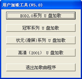 用戶加歌工具是一款可以給U盤加歌曲的工具,支持EOD2.0系列U盤加歌、冠軍系列U盤加歌、狀元(滑屏)系列U盤加歌、高清(2001)U盤加歌。