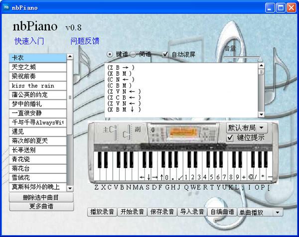 nbpiano模擬電子琴將把你的電腦變成一架高級(jí)電子琴,用戶可以利用它在你的電腦鍵盤上彈奏出美妙的樂(lè)曲nbPiano模擬電子琴擁有很多高檔電子琴才有的功能,如果你有一定的音樂(lè)基礎(chǔ),那么這款軟件會(huì)讓你從中充分感覺到音樂(lè)的樂(lè)趣,讓你充分領(lǐng)略電腦音樂(lè)的美妙。