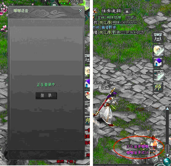點(diǎn)擊這個“小章魚”圖標(biāo)后,就會出現(xiàn)嘟嘟語音的登陸界面,同時游戲窗口右下角“系統(tǒng)信息”中會顯示嘟嘟語音登陸信息。(如圖)