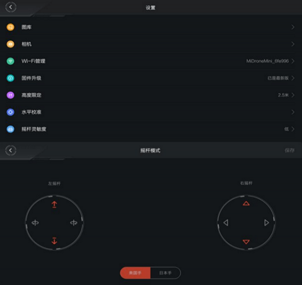 在這里也多說幾句,我們可以點(diǎn)擊操縱頁面右上角的設(shè)置按鈕進(jìn)行一些設(shè)置的更改和調(diào)節(jié),還能查看拍攝的照片和視頻。這里我們可以更改搖桿模式,更改對它的限飛高度(最高25米,默認(rèn)為2.5米),變更照片和視頻的拍攝清晰度,進(jìn)行水平校準(zhǔn)口和更改搖桿靈敏度等。
