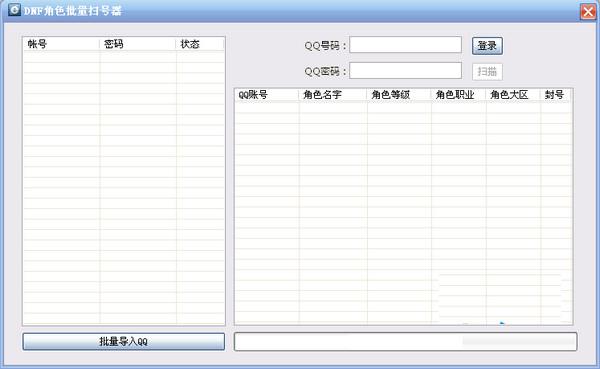 開(kāi)啟軟件后,直接輸入QQ號(hào)碼和密碼,登錄后即可查詢(xún)角色信息,支持批量導(dǎo)入QQ號(hào)。