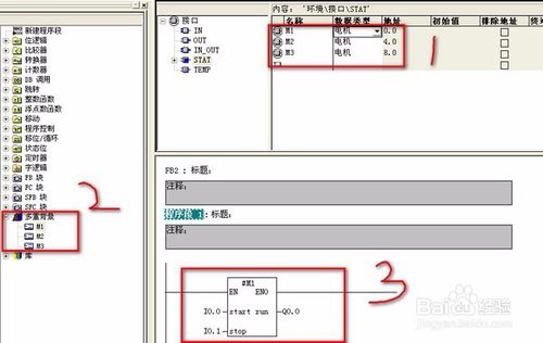 在FB2功能塊中,在接口STAT中創(chuàng)建 M1 "電機(jī)"。此時(shí)就會(huì)出現(xiàn)“多重背景”項(xiàng),把里面的M1..... 拖到程序段中,輸入?yún)?shù)就可以了。