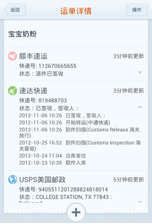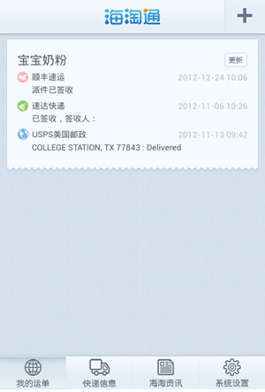 海淘通是手機平臺唯一的海淘一體化物流查詢跟蹤軟件,專為海淘用戶打造的海淘利器!海淘通支持主流的美國快遞、轉(zhuǎn)運公司、中國快遞跟蹤查詢,并實時推送通知,方便您跟蹤海淘物流信息,海淘從此不必?zé)馈?br />