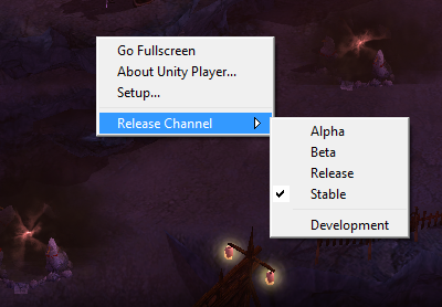 即發(fā)布的web player版本通道。這是Unity4.0之后提出的新的Unity Web Player運(yùn)行機(jī)制。用戶可以通過(guò)手動(dòng)更改來(lái)選擇運(yùn)行游戲的web player版本。目前4.1.2提供了四個(gè)版本通道,即上圖中的“Stable”、“Release”、“Alpha”和“Beta”。默認(rèn)情況下,web player使用的是“Stable”通道。