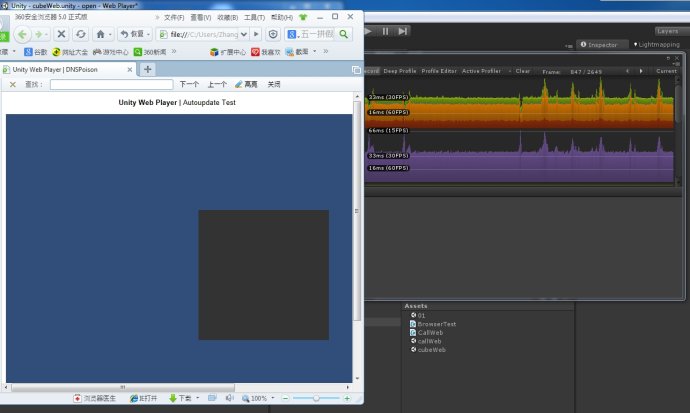選擇Development是指下載并使用當(dāng)前通道的web player的debug版本,其下載位置我們會(huì)在下一章進(jìn)行詳細(xì)說(shuō)明。通過(guò)使用該debug版本,可以讓Unity編輯器中的Profiler直接與目前瀏覽器運(yùn)行的Unity內(nèi)容進(jìn)行信息對(duì)接,從而開(kāi)發(fā)者可以直觀地對(duì)當(dāng)前游戲或應(yīng)用在CPU、GPU和內(nèi)存等方面的消耗進(jìn)行檢測(cè),如下圖所示: