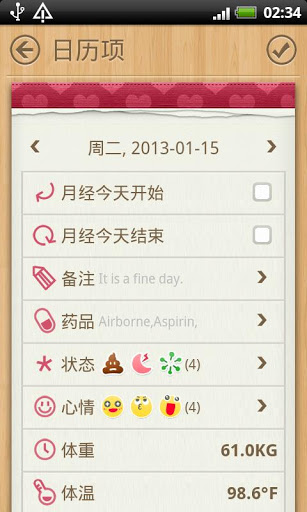 除了基本的經(jīng)期跟蹤功能與經(jīng)期日歷,女孩們可以記錄自己的任何癥狀,情緒,性交,重量,溫度,說明或藥丸等等,實際上它可以設(shè)計成為您的個人日記和小秘書。