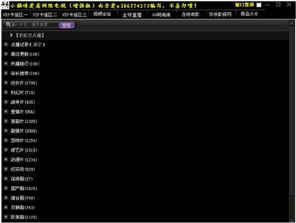小貓咪愛看網絡電視是一款原創(chuàng)的網絡電視集合軟件,擁有目前最全的媒體播放平臺,為確保視覺和感覺效果,以及程序的簡易性和實用性,剔除了廣告,加入縮放功能,可以隨意伸縮大小,加入窗口置頂功能,趕緊去體驗吧。