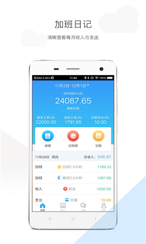 您也許在連鎖行業(yè)、工廠制造行業(yè)、餐飲服務(wù)員、門衛(wèi)保安、外賣快遞配送員、銷售等各類公司企業(yè)有不小建樹,正好在58同城、51job、前程無憂、趕集網(wǎng)、百姓網(wǎng)、智聯(lián)招聘找到了工作。而釘釘、喔趣考勤、mori記賬無法滿足您的要求,那就選擇加班日記!從此紙筆、記事本、云筆記軟件、計(jì)算器、記賬本、工資單皆為路人。讓記加班、記考勤、記工時(shí)、算工資變得簡單,新增記賬本功能更是各位藍(lán)領(lǐng)白領(lǐng)打工族的記事日記,是打工達(dá)人的挖財(cái),理財(cái)小幫手。