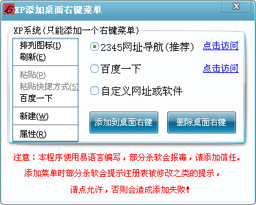 xp添加桌面右鍵菜單是一款往鼠標(biāo)右鍵菜單里添加選項的綠色工具,可以用來為右鍵菜單加上自定義的鏈接,方便日常工作或?qū)W習(xí)操作。