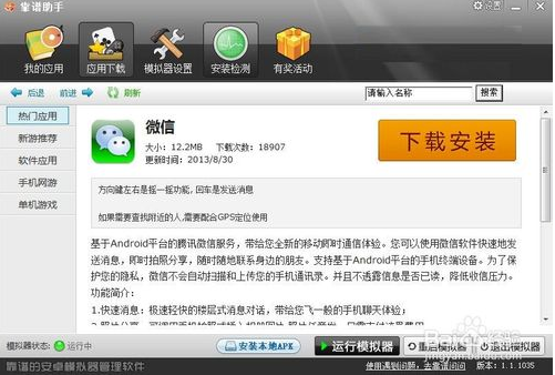 1、首先,我們安裝好靠譜助手,第一次運(yùn)行須時進(jìn)行安裝檢測工作,并選擇在線安裝模擬器,等待安裝完成便可以開始體驗(yàn)電腦上運(yùn)行安卓應(yīng)用了。2、打開靠譜助手,目前我們還是空白的,立即挑選應(yīng)用吧!點(diǎn)擊即可獲得最新最熱門的手機(jī)應(yīng)用。