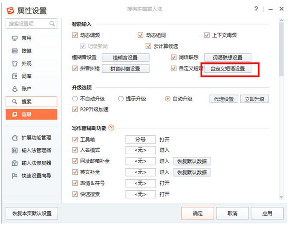 2、在高級(jí)中選擇“自定義短語(yǔ)”==“直接編輯配置文件”