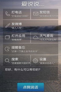 愛(ài)說(shuō)說(shuō)語(yǔ)音助手是云知聲旗下的一款國(guó)內(nèi)優(yōu)秀的中文語(yǔ)音助手軟件,采用了云知聲自主研發(fā)的語(yǔ)音識(shí)別云,能夠完美支持普通話;愛(ài)說(shuō)說(shuō),以用戶需求為核心,在電話、短信、微博、天氣、搜索、備忘、百科、應(yīng)用等等各個(gè)領(lǐng)域不斷探索