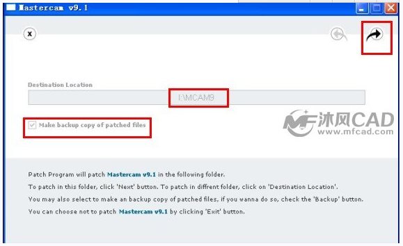 選擇好mastercam9.1的安裝路徑,然后把 make backup cope of patched files前面的對(duì)勾打上,然后點(diǎn)擊下一步,如圖: