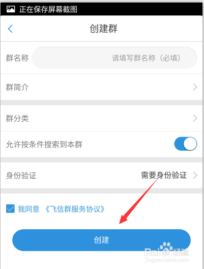 然后輸入我們的群的名字等等信息,然后點(diǎn)擊最下方的『創(chuàng)建』,如圖示。