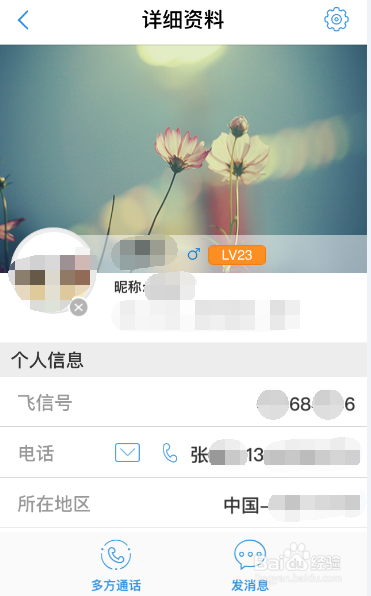 在好友頁(yè)簽選擇某好友后可進(jìn)入詳細(xì)資料的顯示頁(yè)面,選擇發(fā)“消息”;