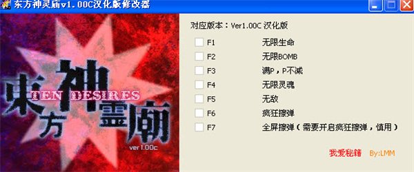 東方神靈廟七項(xiàng)修改器是同名游戲的輔助修改工具,提那家無敵,瘋狂擦彈以及全屏擦彈等變態(tài)屬性,充分滿足玩家的各種需要,是你通關(guān)殺敵的好幫手。