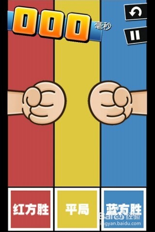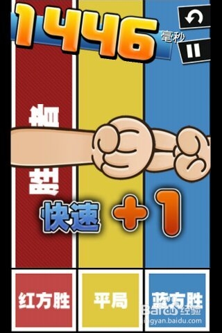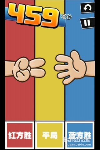 第二關則是猜輸贏,你需要用最短的時間判斷出兩只手的猜拳輸贏,然后點擊畫面下方的按鈕,選對了加分選錯了要減分,所以千萬不要光顧著速度快否則很容易選錯了把分數全扣光了。